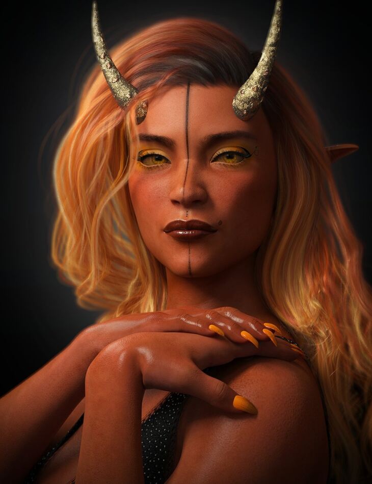 She comes with an HD sculpted head and plus-sized body, PBR Iray skin, horns, FiberMesh brows and a lot more.