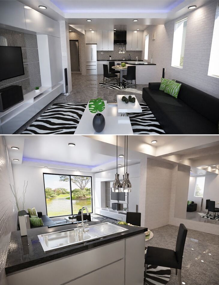 Here we have an Open Kitchen and Living Room. A nice, cozy and spacious area for both Kitchen and Living Room. A very plain color approach were applied in this design.