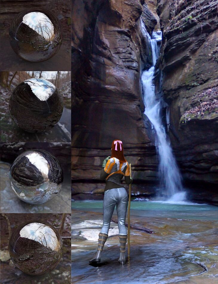 Orestes Iray HDRI Environments - Frost Falls is a set of 4 photographed (for ultimate realism) high dynamic-range panoramas for lighting your Iray renders.