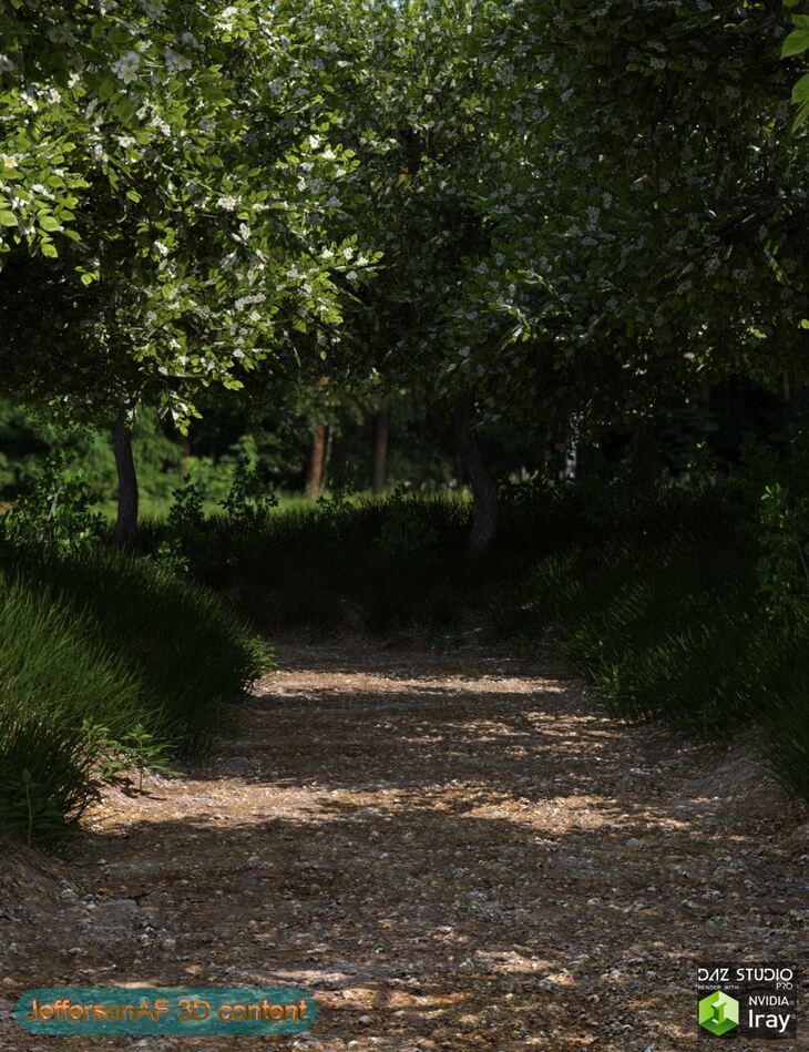 This scene will take you through a beautiful path between trees with dense grass and bushes.