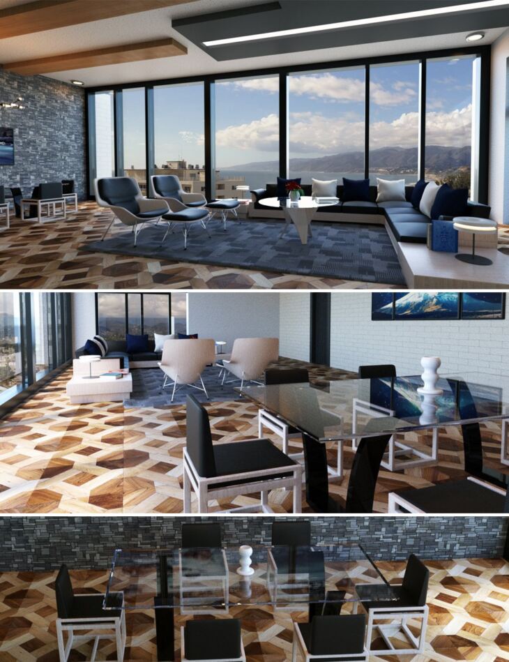 A 3d model of Penthouse Living Room. It has a comfy Chair with Ottoman, together with a nice modern Sofa. A balcony was included in the model. Nice ceiling design was made to match the elegance of the place. An industrial chandelier was placed on top on the simple Dining table and chairs.