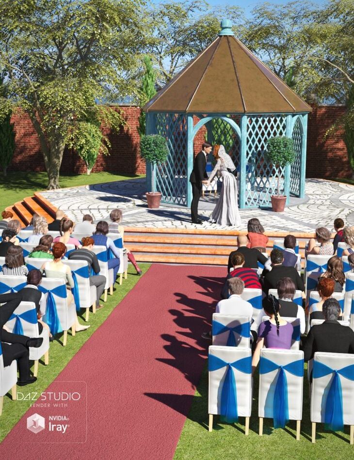Includes 3 tree styles, a pergoda with patio, a ceremony chair with 4 sash styles, walls, carpet and base.