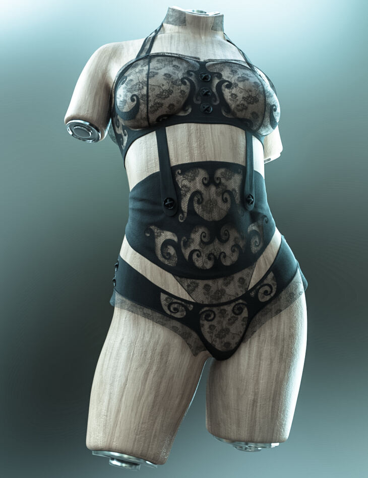 It is composed of four pieces, a collar, a chest, a belt, and its straps and knot, as well as a panty.