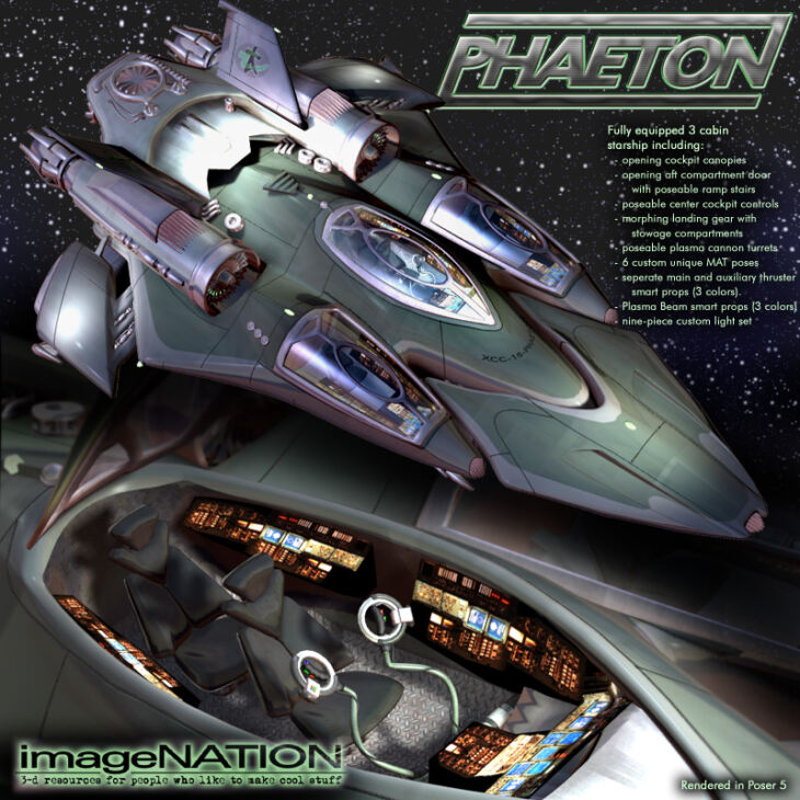 The Phaeton Starship from ImageNation represents a versatile and beautiful blend of design, function, and style. Detail abounds, from the intensely textured and modelled cockpits to the intricately designed landing gear.