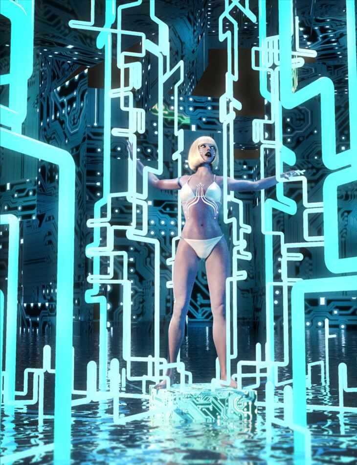 The Phenolic Sphere is a large computer with a base platform, instances, glowing conduit, spotlights, and a large water prop as coolant. The three-color spotlight rotates on a central node and includes a section plane that allows light inside the sphere.