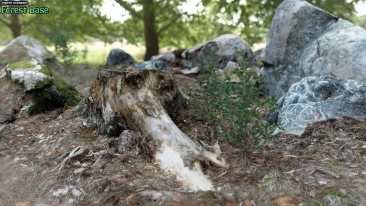 Forest base contains 6 stump bases, 6 rock bases, 3 logs, 1 terrain prop and 3 bushes, all with high-resolution textures.
