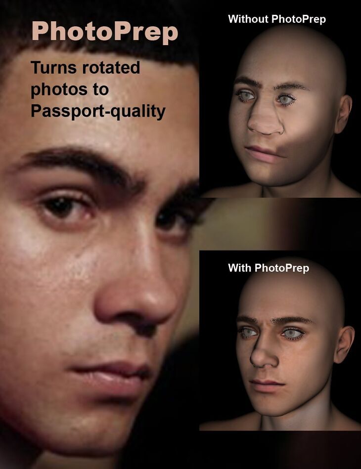 Turning rotated heads, poorly lit photos, or open smiles into high-resolution (4000 x4000) JPG images makes it easier to create 3D heads in applications that otherwise could not handle such photos.