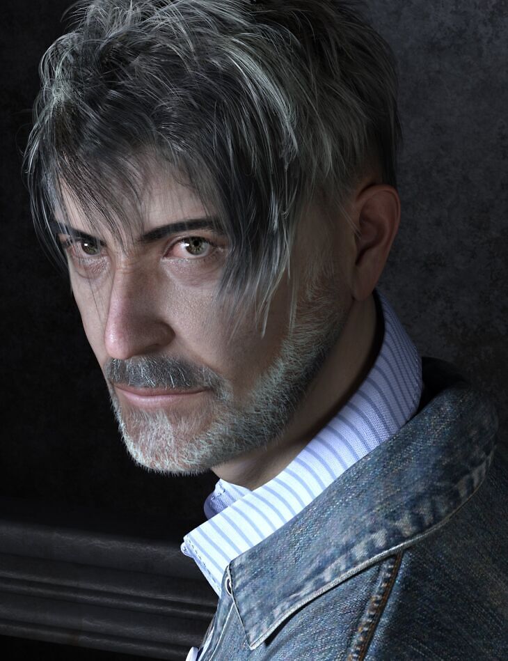 Roderick is a custom figure whose head is sculpted from the Genesis 9 base and body from the Genesis 9 Masculine base, with unique fibermesh hair and tattoo options, optimized for Iray. He uses the PBR shading system.