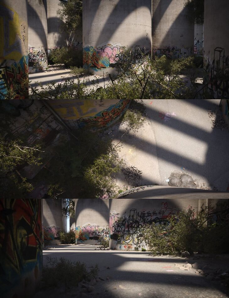This edgy photoreal scenery, full of graffiti, abandoned concrete pillars and trash, with mother nature's own green twist is perfect for your vibrant photoshoots, cool renders and secret rendezvous or action renders.