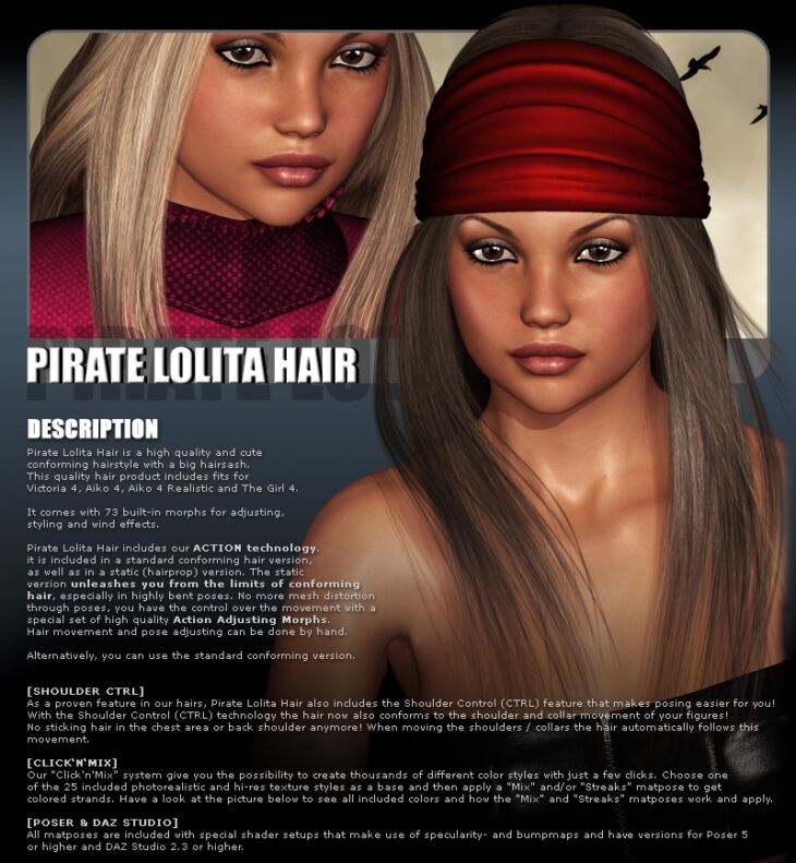 Pirate Lolita Hair is a high quality conforming hairstyle for Victoria 4, Aiko 4 and The Girl 4.