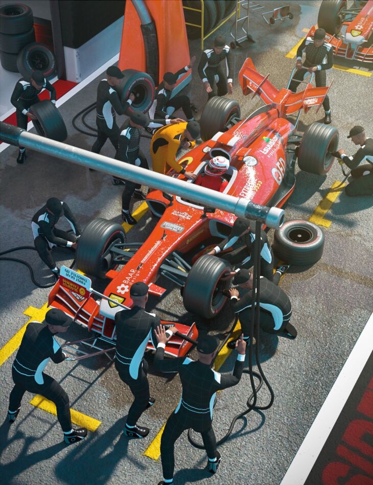 Pit Lane Poses and Props for Genesis 8 Male is a fast and furious pit stop of 20 dynamic poses for Genesis 8 Male and the Fermion Race Car. This set also includes several pit lane props, a fully rigged Overhead Pneumatic Rig, 4 types of fully rigged wheel gun and lines, wheel gun prop, single race tyre and a lollipop sign.