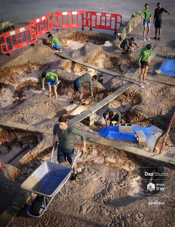 This set of fifteen figure poses for Genesis 8 will unleash a team of experts on the detailed Archaeological Dig Site by David Brinnen and ForbiddenWhispers. Everything needed to scrape, shovel, brush, and move rubble is provided to start your story. A full set of complementary wearables is included to equip the essential tools of the profession.