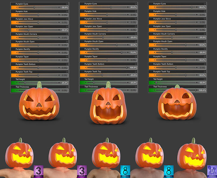 The pumpkin prop can be used as a standalone object. Or it can also be weared as a helmet with included presets for Genesis 3, 8, 9 Males and Females. The prop has 12 morphs, so you can achive various shapes.