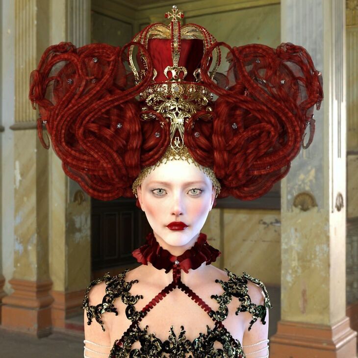 Five conforming pieces and four smart props, this will turn all your characters into queens! You cannot believe your eyes: two fantasy hairpieces, a crown with pearls and gems, jewels and a sexy bodysuit will make heads turn.