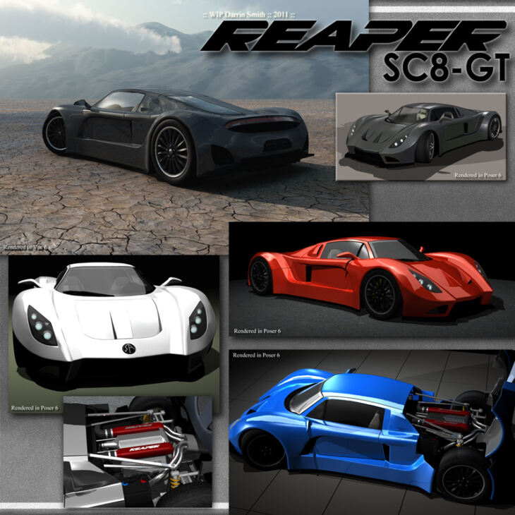 The REAPER SC8-GT is a concept car I designed. It's meant to invoke that exotic car feel. SC8-GT refers to the Super Charged V8 Gran Touring or Gran Turismo (Grand Tourer) trim level.