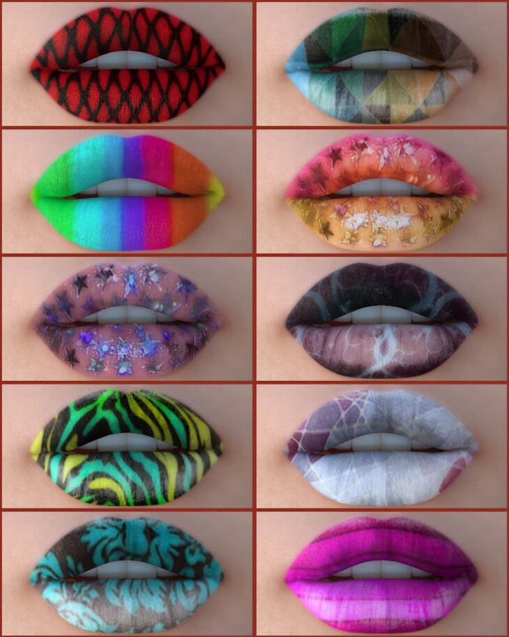 This is a set of 50 beautifully detailed lip files, in transparent PSD format. These were created specifically with V4 in mind. I have created these to cover all bases from natural to Glamorous to fantasy. Combine these psd's with each other, or with your other lip resources resources for endless possibilities.