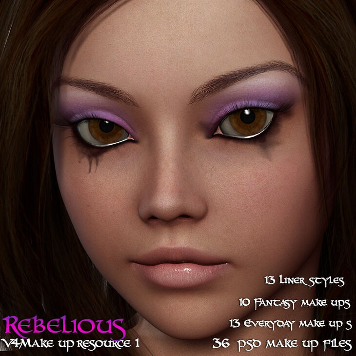 This is a set of 36 fun, flirty and beautifully detailed, eye make up files, in transparent PSD format. These were created specifically with V4 in mind. I have created these to cover all bases from natural to full fantasy. Combine these psd's with each other, or with your other make up resources resources for endless possibilities.