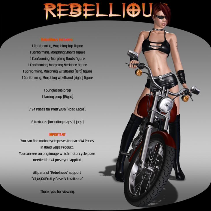 Rebellious! The name says it all: attractive, yummy, delicious, luscious, exquisite...add sexy and sensual and you have the perfect description of this all new outfit for Pretty BaseIV, Kaileena, V4, G4 and A4.