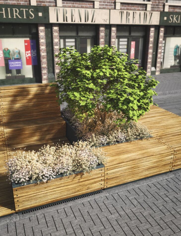 Reflection is a modular parklet made up of 11 individual bench modules. A number of the modules are made up of mixed planting (made with instances), perfect to bring that little touch of nature.