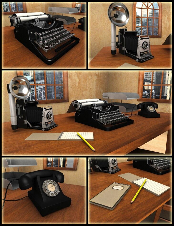 A Typewriter with controllable keys, type bars, ribbon spools and sliding platen to simulate the mechanical features of a working typewriter. Telephone with movable receiver, dialer and cord. Classic reporters camera, office paper tray, notepad and pencil. A practical Set with versatile elements.