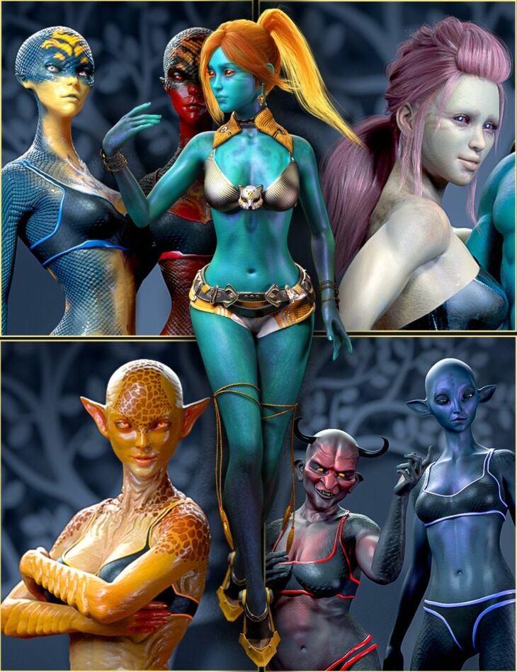 Reptilian Skins for Genesis 8.1 Females is a texture pack that consists of 4 distinct skins (and alternate versions) to change any character into an alien or a fantastical creature.