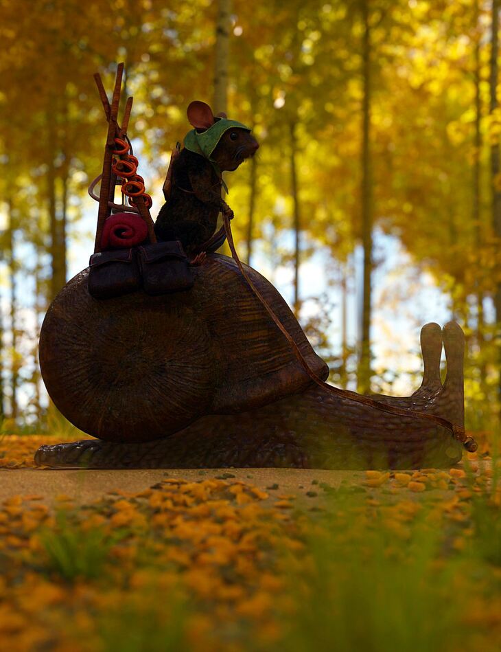 The Riding Snail comes complete with a saddle and harness. Pouches, a blanket, and a lantern set the scene for adventure.