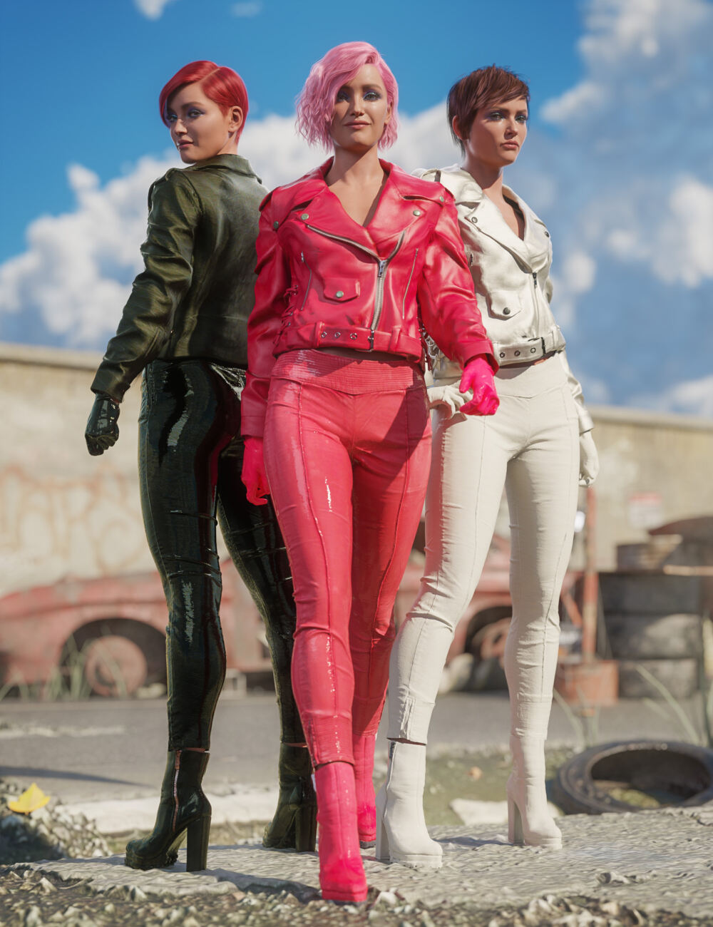 Road Rash for Genesis 8 and 8.1 Females is a edgy, leather, sassy looking biker outfit featuring a jacket, pants, boots and gloves. It comes in a selection of colors for added versatility.