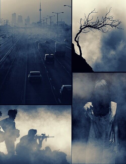 A fog's atmosphere gives a mist over, hazy, obscure, or diffused look causing reduced visibility.