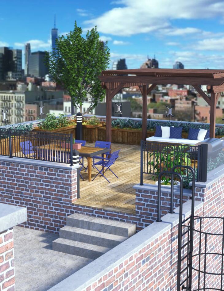 Beautifully arranged comfy furniture, a barbecue grill, and luscious greenery remarkably transform your old building rooftop into a suburban and residential space that's perfect for relaxation.