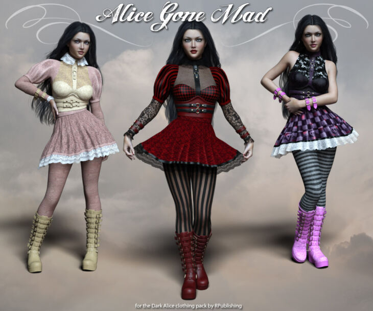 Alice Gone Mad is an add-on texture package for the Dark Alice clothing pack for Genesis 3. Mix and match these textures together and with the default textures in Dark Alice for some crazy and fantastic fun!
