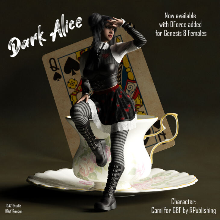 Although the Dark Alice pack was created for Genesis 3, it works very well on Genesis 8 as you can see some of the promo images made with the Character Zhi for G8.