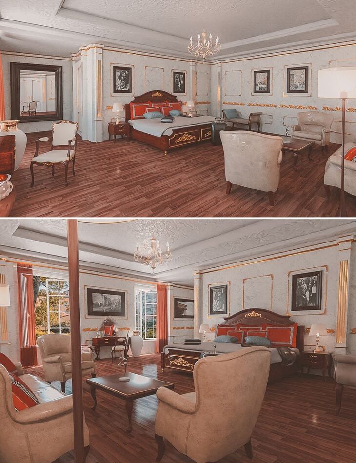 Modeled after the ornate style of the contemporary Russian upper middle class, the Russian Bedroom has a detailed interior and has everything your characters need to relax in comfort after work.