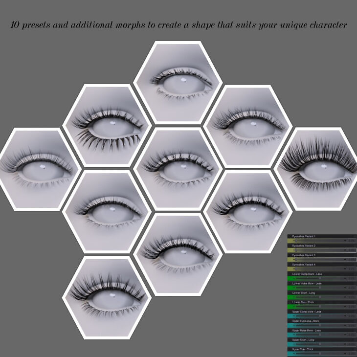 - Load your character and conform the product to it. Use the included presets and morphs to create the desired eyelash shape. Export the result as an object at base resolution.