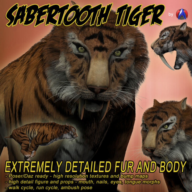 The model is Poser/Daz ready with figure, finely tuned run and walk cycles, ambush pose, sitting pose, and two full body morphs for roar (fully open mouth), claws in/out. The model has a highly detailed fur that conform automatically to the body mesh.