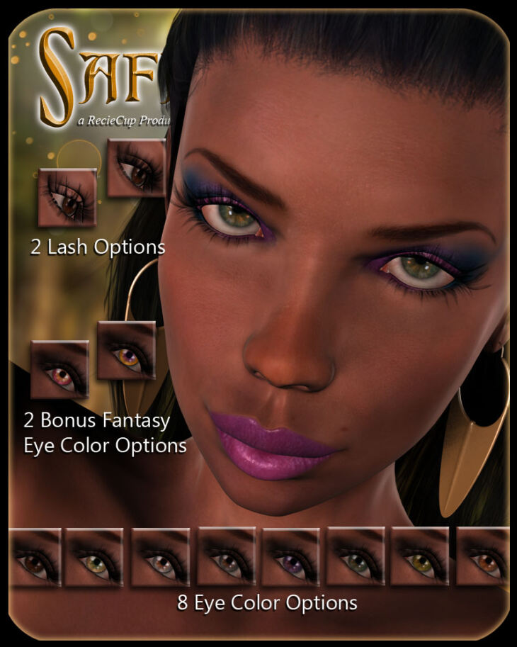 Safari is an ethnic fantasy beauty for V4.2. She comes with makeup and eye color options and 2 lash options. Also included is a fantasy texture option with matching eye colors.