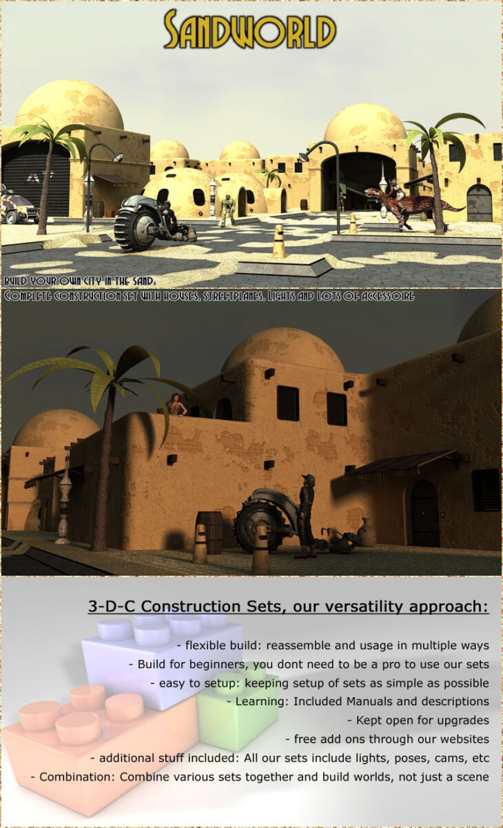 Sandworld is a versatile set of a city in the desert. It comes as a set of four main house builds with various options to build together. Streetplanes, add on props, lights and mat sets, as well as a hemisphere for Day, Dawn and Night are included.