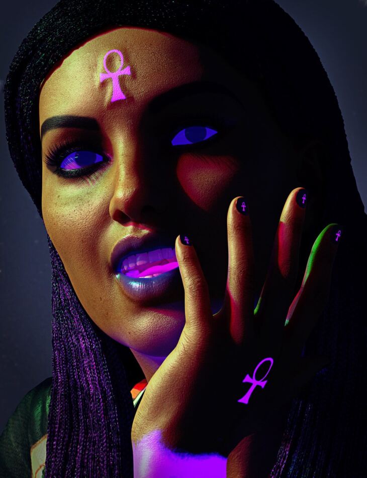 Her forehead, hands, and nails glow with the symbol of life. Her eyes shine in a variety of colors, and with the easy-to-apply MouthLight prop, her mouth and throat are illuminated in matching hues. Each of these have multiple luminescence settings to add variety to your renders.