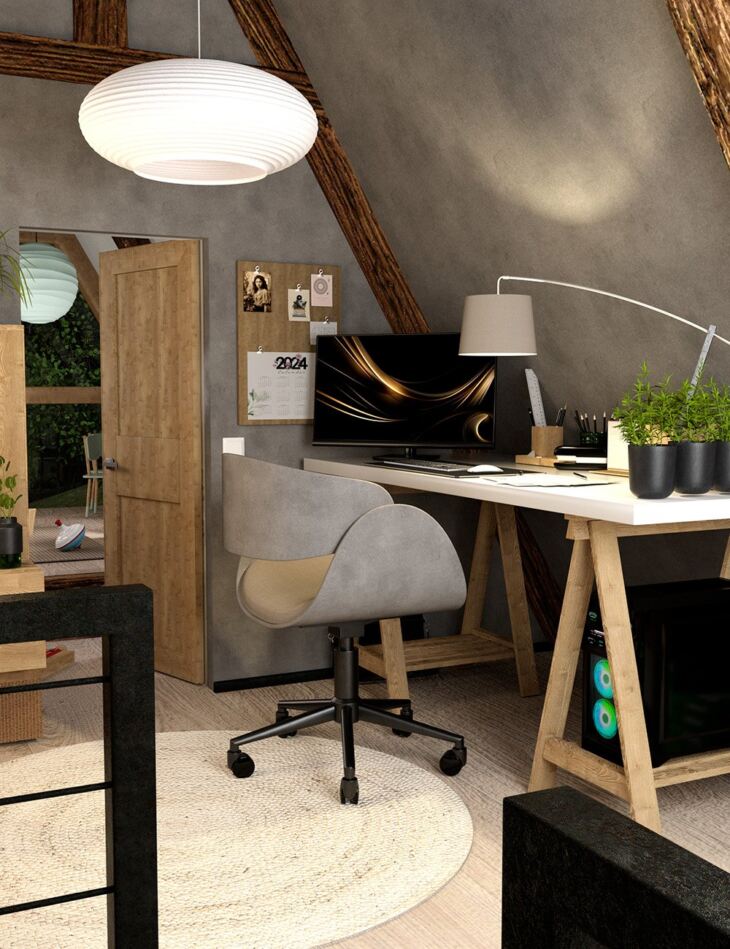 In this last part of the interior add-ons for the Scandinavian Style A-Frame House, you will find an Office on the first-floor mezzanine and a room for children with a nice few on the back of the landscape.