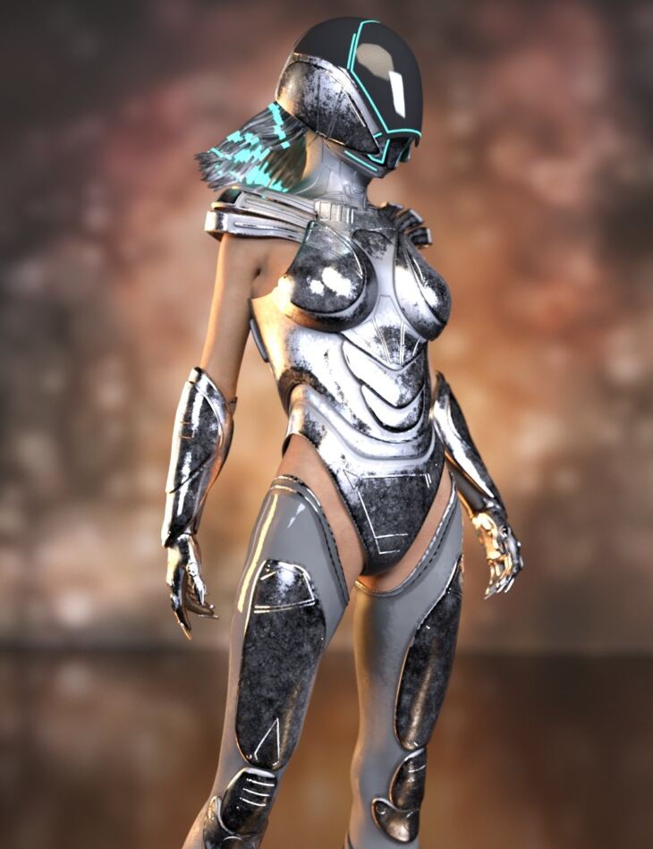This high-tech outfit features a unique design with full-body metal armor. It includes six props and seven IRAY Material Presets.