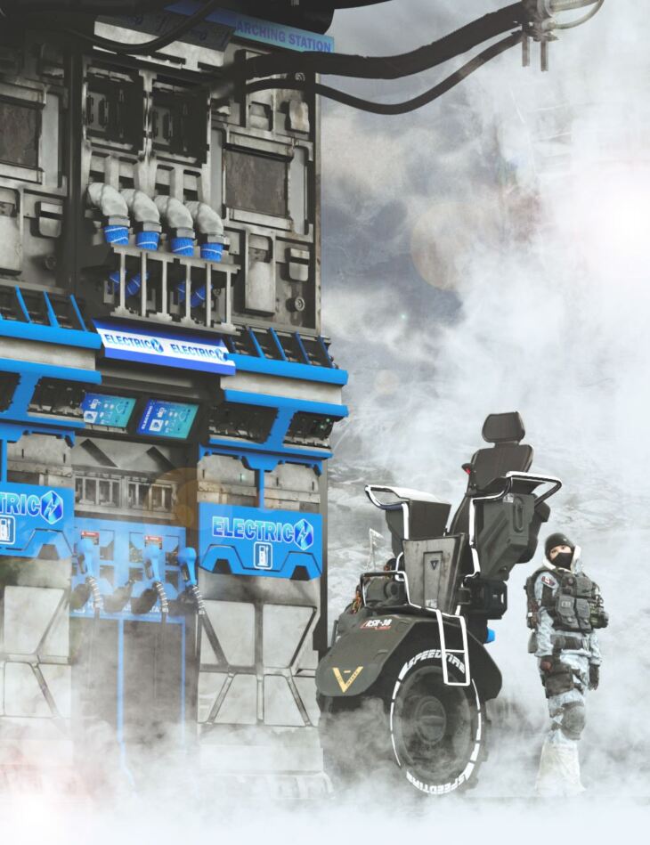 Sci-fi Charging Station Unit is a set consisting of an electric service station and a one-wheeled motorcycle delivered with a set of 5 different textures.