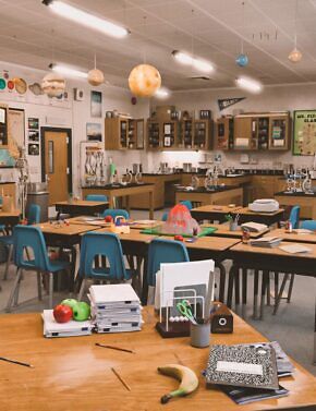 Included are cabinets and work areas at which to conduct experiments, classroom tables and chairs for normal classroom instruction, a teacher's desk, and room sections that can be used to build the classroom itself. The set includes a microscope, test tube and holder, books, and a flask.
