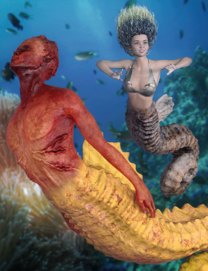 This Mega Bundle includes SeaHorse Coralia for Genesis 8.1 Female and for Seahorse Tails, SeaHorse Corynn for Genesis 8.1 Male and for Seahorse Tails and also includes the Tail Only options for most of the SeaHorse textures.