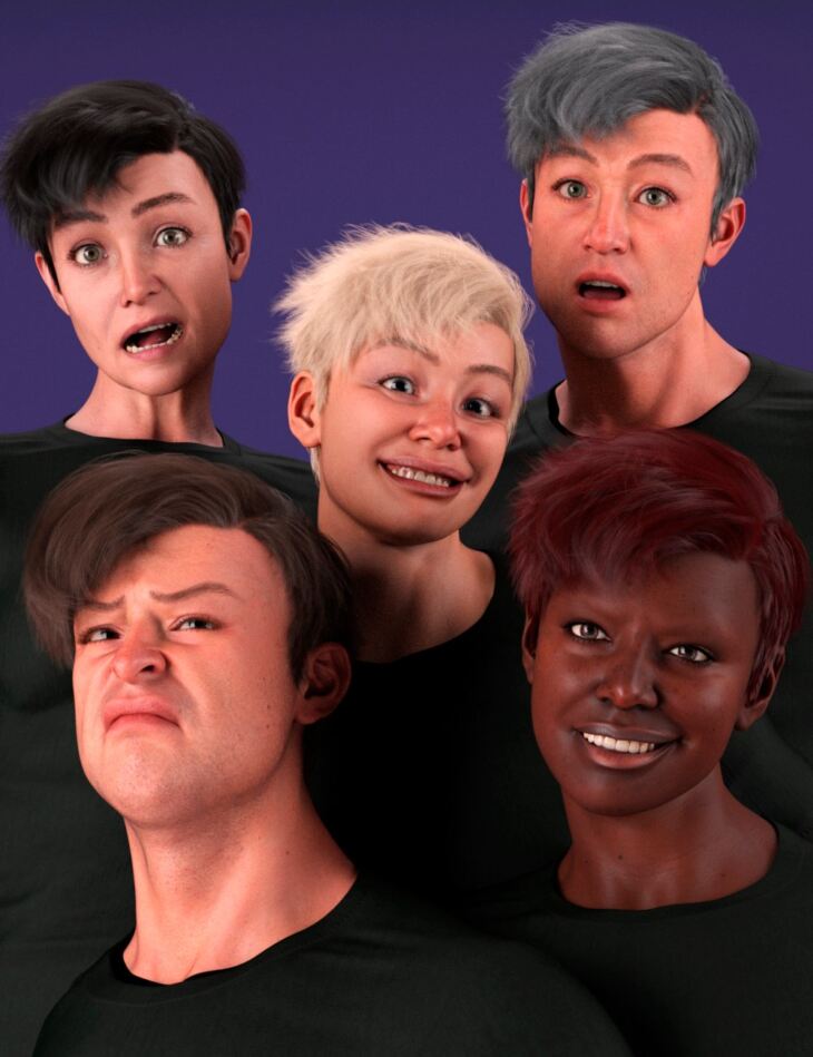 This collection of 60 different expressions and pose presets shows the finest gradations between all variants of a smile, anger, sadness, surprise, and fear.