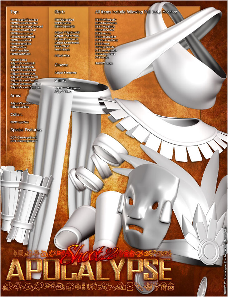 SHOOT 22: Apocalypse is a brand new outfit set for V4 created by outoftouch & Shana, and it's composed of 06 Super-Conforming Clothing Figures (Arms, Collar, Gloves, Skirt, Top) and 03 Props (Earrings, Headpiece, Mask). Use the Popups to see each style in full detail.
