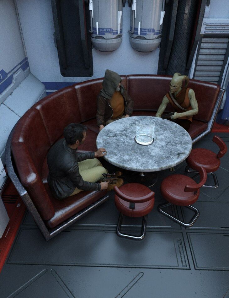 The set has a modern, still somewhat worn look, and it can be fit into your favorite futuristic environment for relaxing conversations or tense business deals with alien races going wrong.
