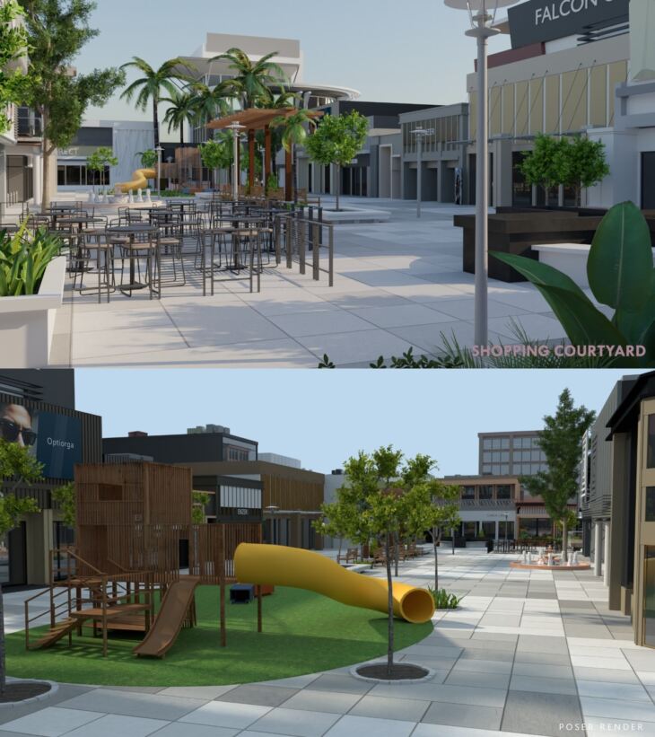 The Shopping courtyard is a neat little mall under the open sky, allowing more space between stores and extra seating, including a kids play area.