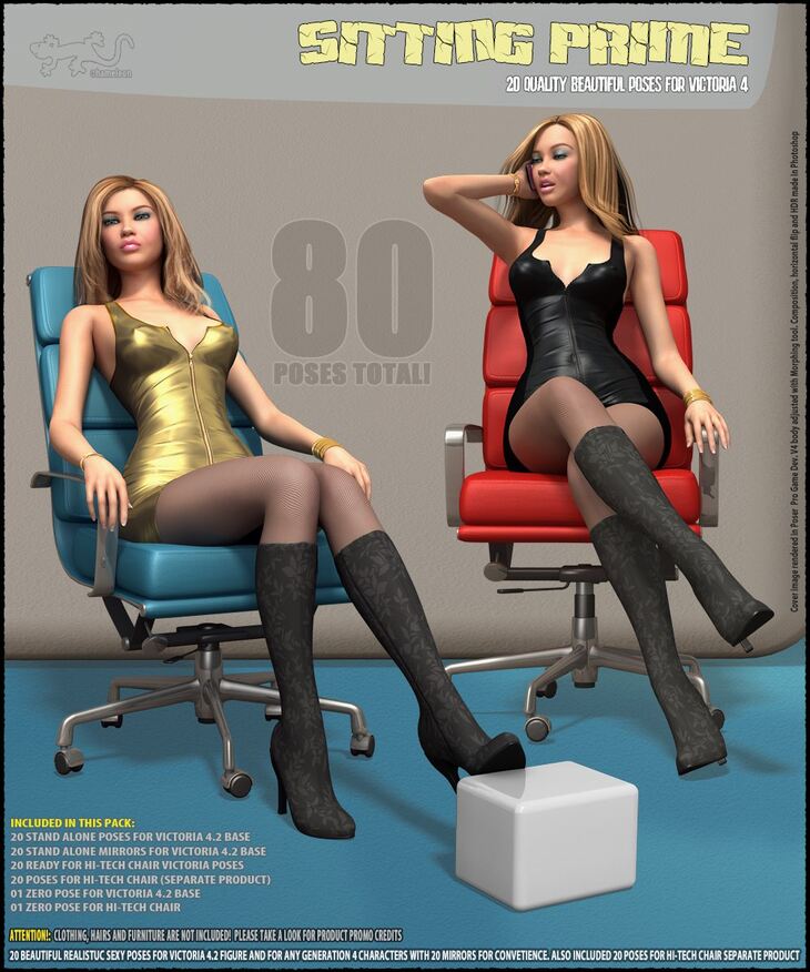"Sitting Prime - Poses for V4" - 40 Beautiful and detailed poses (20 for Victoria 4 + 20 poses for "Hi-Tech-Chair" figure). Also included 40 standalone V4 poses (20+20 mirrors)!
