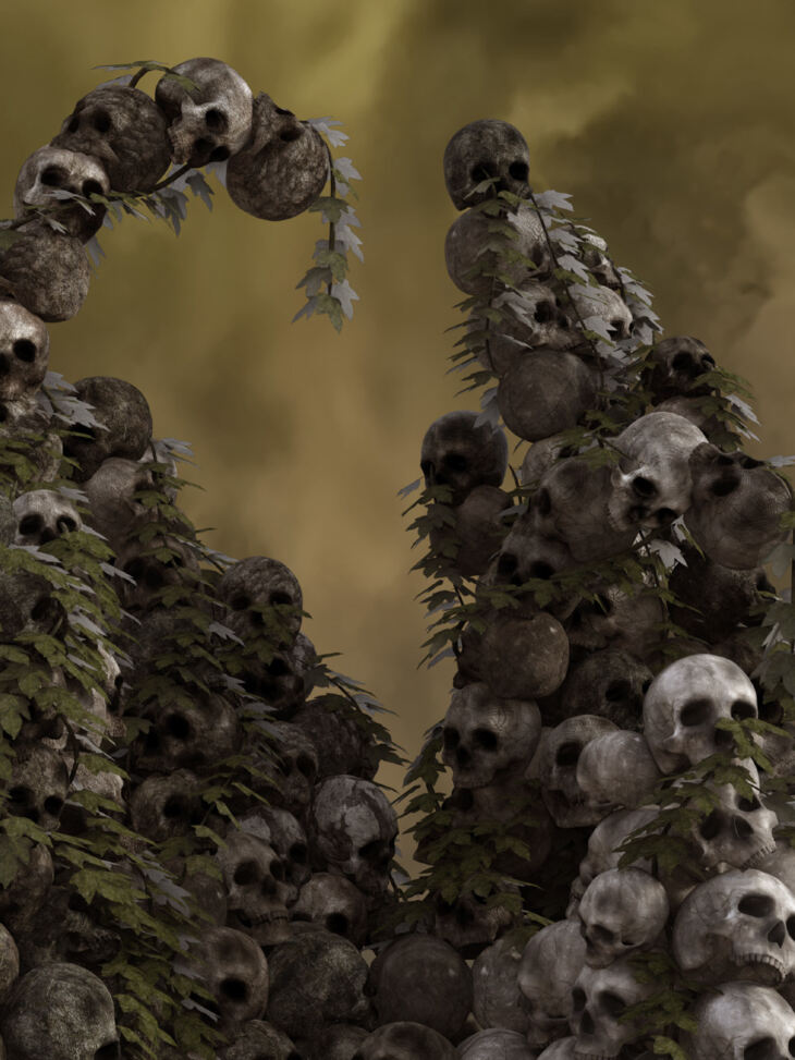 This distinct and unique set takes piles of skulls to new heights. Each of the props features numerous skulls, piled up and intertwined with ivy. Use individually for a touch of darkness in your scene, or fill the scene with lots to create an entire morbid landscape.