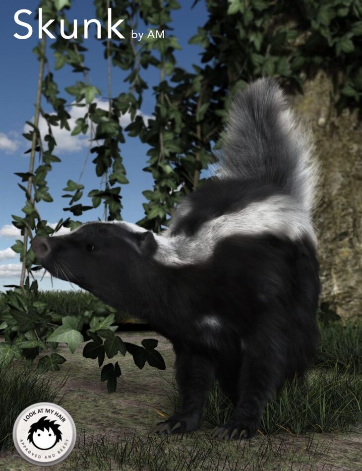 The shy and docile Skunk, 11 poses, several morphs, finely rigged and weight mapped for both Poser and DAZ Studio, and Look at my Hair fur presets to provide the most realistic renders.