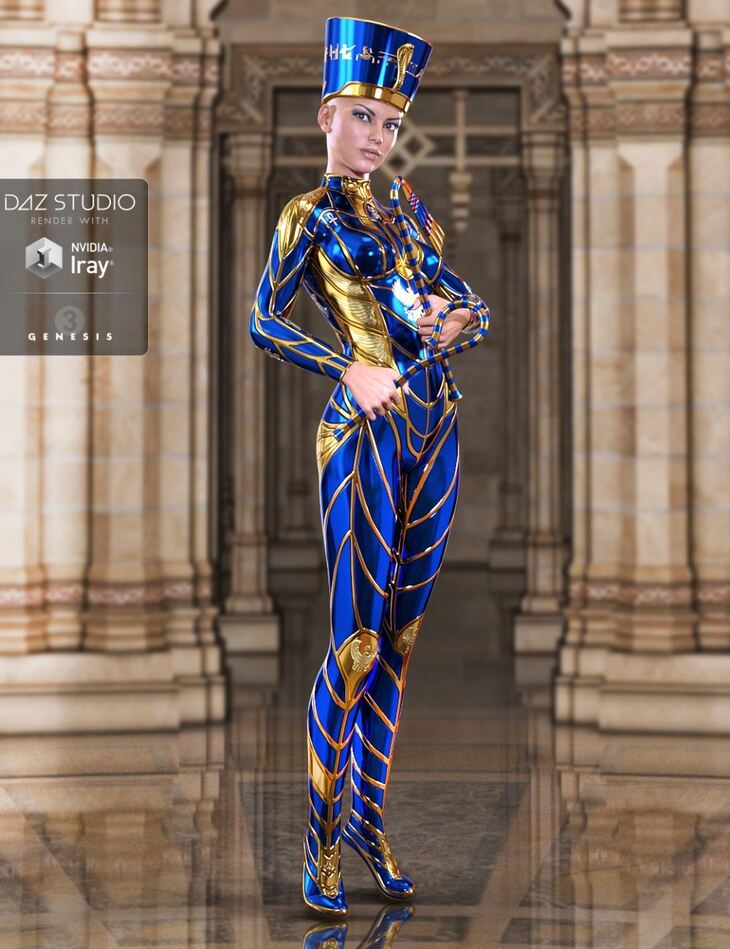 This is a clothing set for Genesis 3 Female(s). It has a Full Body Suit and Egyptian Crown plus a custom nails morph "Demon Claws" and Smart prop Crook and Flail.